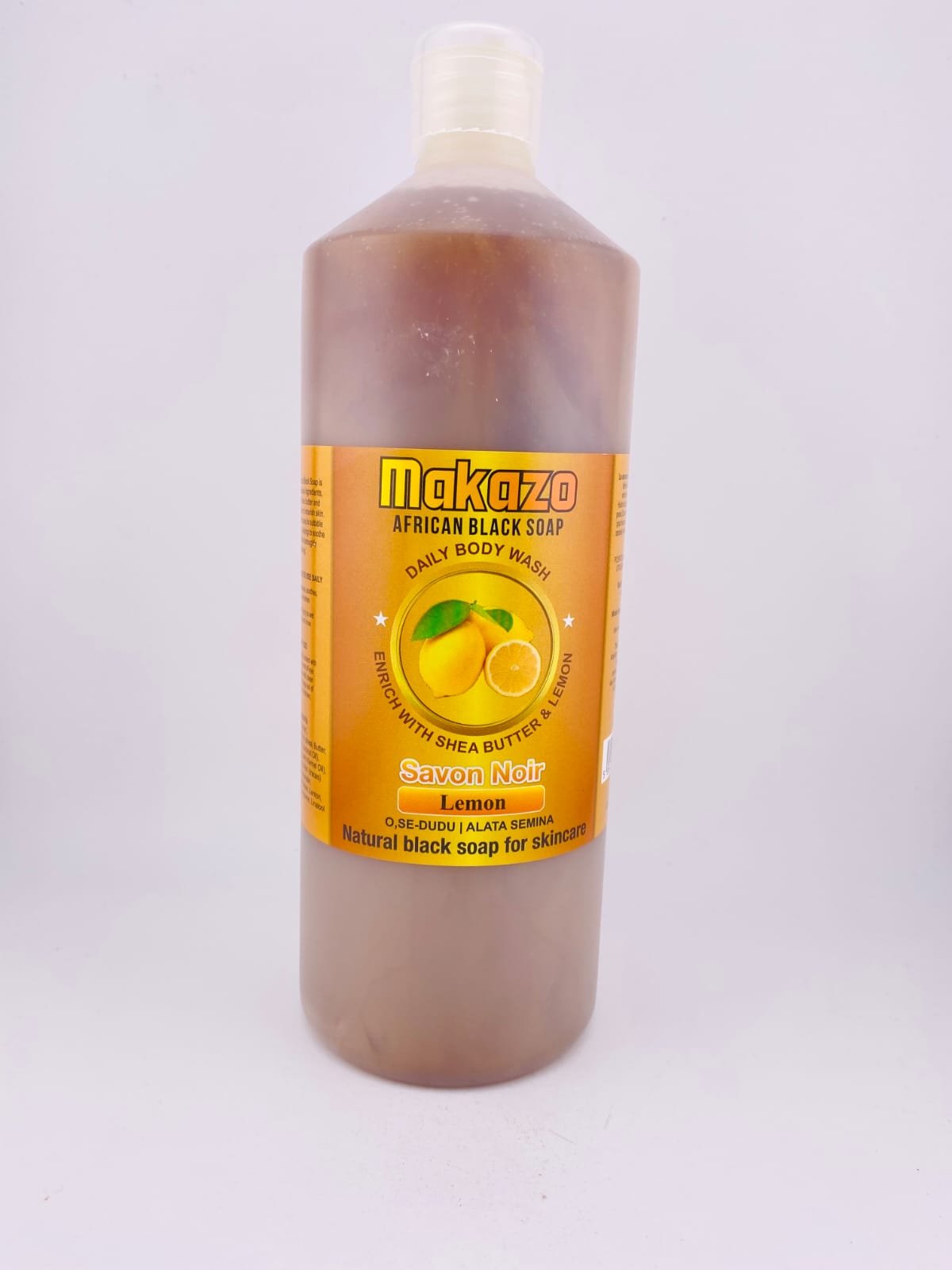 MAKAZO African Black Soap Lemon is a naturally-derived liquid black soap body wash formulated to gently cleanse and refresh the skin. It’s enriched with lemon scent/extract along with shea butter and aloe vera to help leave skin feeling clean, soothed, and revitalized with a fresh citrus touch, making it suitable for daily use on all skin types.