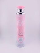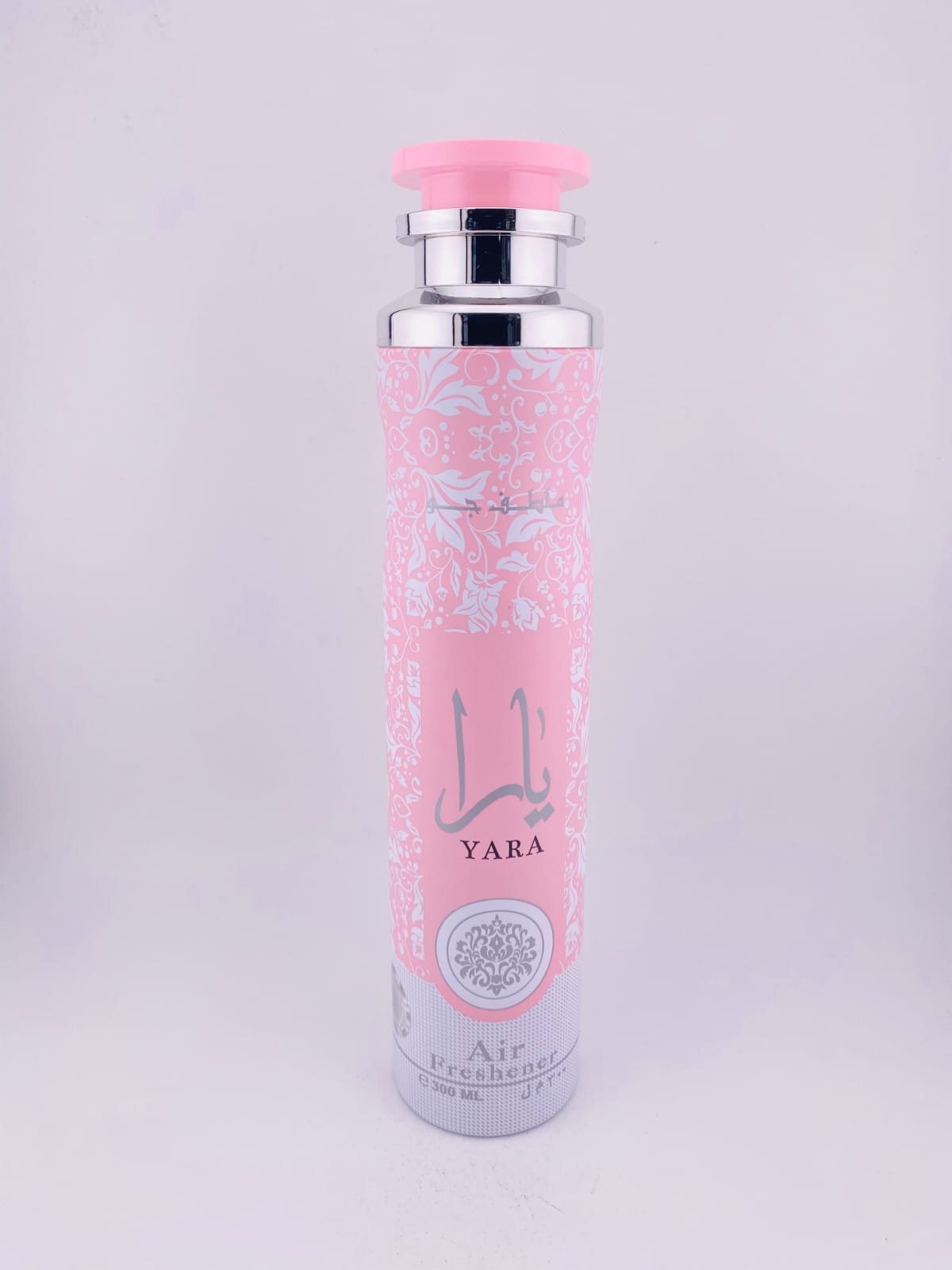 YARA Air Freshener is a room and space spray by Lattafa that neutralizes odors and freshens the air with a pleasant floral‑fruity‑woody fragrance. It typically opens with citrus and fruity notes (like orange and tangerine) and flows into soft floral accents (like rose) with a warm musk or sandalwood base, creating a fresh, inviting, and long‑lasting scent ideal for homes, offices, cars, or linens.